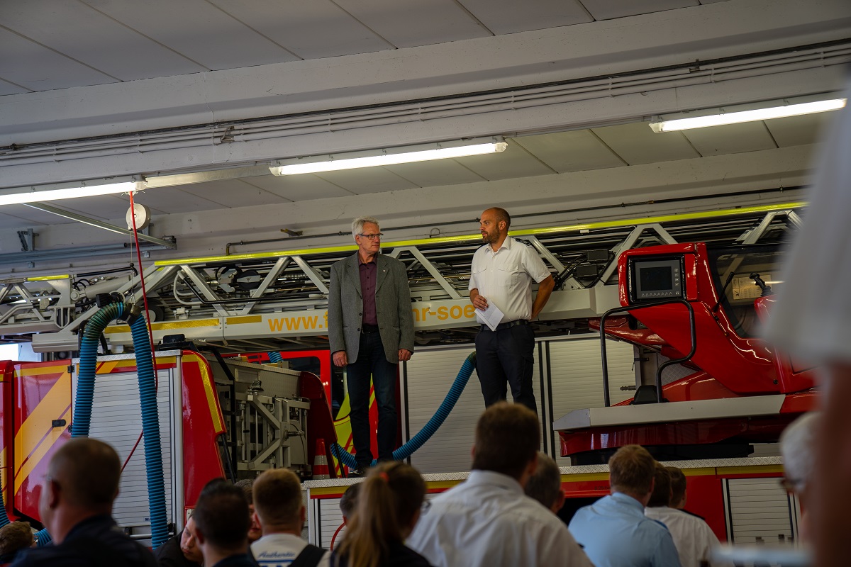 Auf einer provisorischen Bühne oder besser gesagt auf der Plattform der Drehleiter, konnte die Anhörung durchgeführt werden.