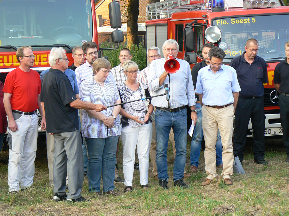 "Jetzt geht es endlich los", sagte Bürgermeister Dr. Eckhard Ruthemeyer. Er betonte, dass es für die Unterstützung der Feuerwehr stets einen breiten Konsens zwischen Verwaltung und Rat der Stadt gebe. Auch der Neubau des Feuerwehrgerätehauses in Ampen sei deshalb ein Gemeinschaftsprojekt, "damit wir dank der Feuerwehr nicht nur im Zentralort, sondern auch in den Ortsteilen ruhig schlafen können". Ortsvorsteher Ulrich Dellbrügger dankte ebenfalls den Aktiven der Feuerwehr, "die durch ihren Einsatz Leben und Eigentum retten". Die Feuerwehr sei ein ganz wichtiger Bestandteil der Dorfgemeinschaft. Mit dem Baustart für das neue Feuerwehrhaus sei Ampen nun "am Ende eines langen Weges", weil das alte Gebäude ausgedient habe. Sein Dank gelte allen, die sich für ein neues Gerätehaus eingesetzt hätten. Eine Schweigeminute galt anschließend dem früheren Löschgruppenführer Norbert Faulstich, der sich jahrelang intensiv für den Neubau des Gerätehauses eingesetzt hatte und vor wenigen Wochen verstorben war.