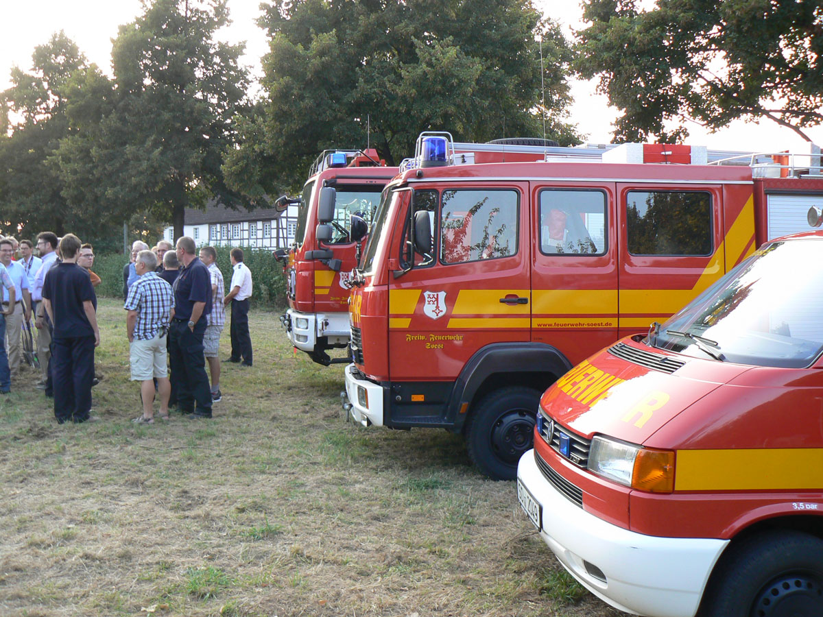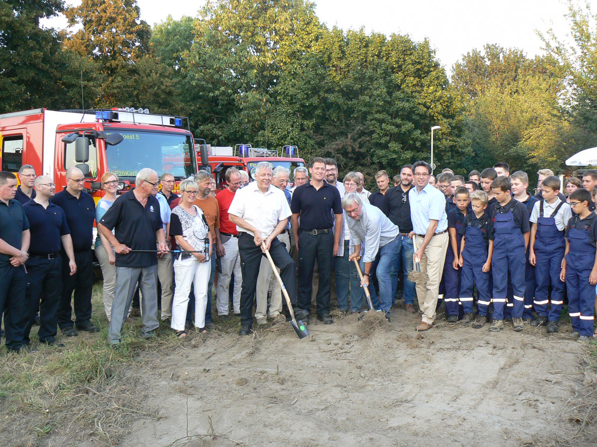 Auf einem Grundstück an der Werler Straße in Ampen hat der Bau eines neuen Feuerwehrgerätehauses für die Löschgruppe Ampen begonnen. Bürgermeister Dr. Eckhard Ruthemeyer, Ortsvorsteher Ulrich Dellbrügger und Stadtbrandinspektor Jürgen Wirth führten am Mittwochabend gemeinsam den symbolischen ersten Spatenstich durch. Feuerwehrkameradinnen und Feuerwehrkameraden aus Ampen, vom Löschzug 5 und von der Jugendfeuerwehr, Vertreter des Soester Rates sowie viele Anwohner kamen ebenfalls zu dem Baustart und stießen mit kühlen Getränken auf einen hoffentlich reibungslosen Verlauf der Baumaßnahme an.