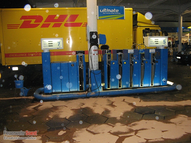 Auf einer Tankstelle wurde durch einem LKW eine Zapfsäule beschädigt, dadurch sind mehrere Liter Diesel auf einer Fläche von ca. 15x20 Meter ausgelaufen.