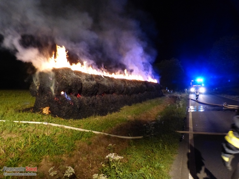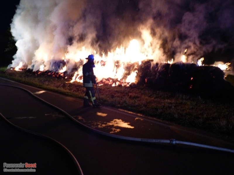 Auf einem Feld brannten ca. 20 Rundballen in voller Ausdehnung. Die Ballen wurden mittels Trecker auseinandergezogen und anschließend abgelöscht.
