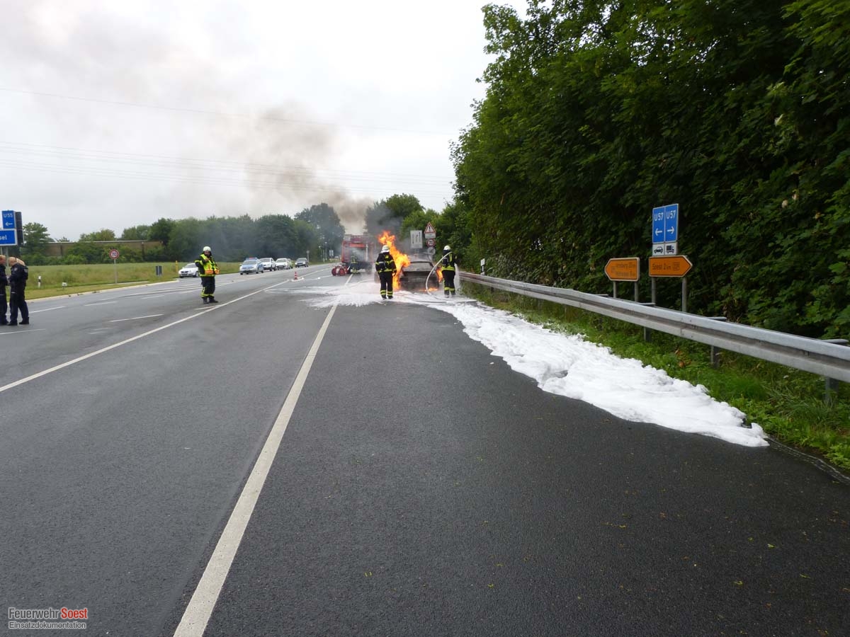Ein Sportwagen brannte in voller Ausdehnung, die Feuerwehr nahm einen massiven Schaumangriff vor.https://www.facebook.com/FWSoest/posts/629694637183956