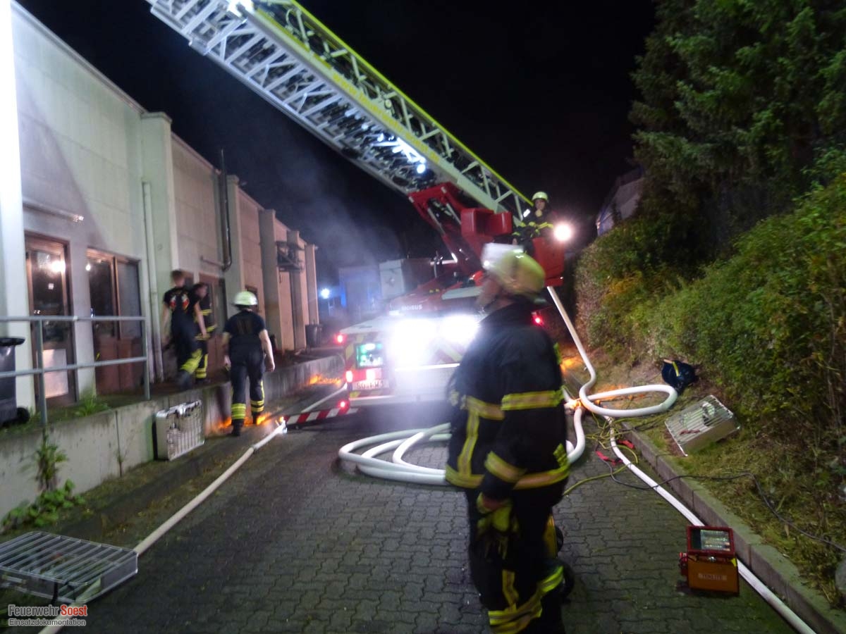 Der Lagerbereich eines Discounters stand im Vollbrand. Die Feuerwehr bekämpfte diesen mit einem massiven Außenangriff, während ein weiterer Trupp durch den Verkaufsraum die Brandausbreitung an der Brandschutztür des Lagers zum Markt hin verhinderte. Es war jedoch eine erhebliche menge Brandrauch in den Verkaufsraum eingedrungen, so dass dieser mit Großraumlüftern entraucht werden musste.Da die Brandstelle direkt an die Fahrzeughalle des THW angrenzt, wurde auch dieses alarmiert, um die Fahrzeuge vorsorglich in Sicherheit zu bringen.
