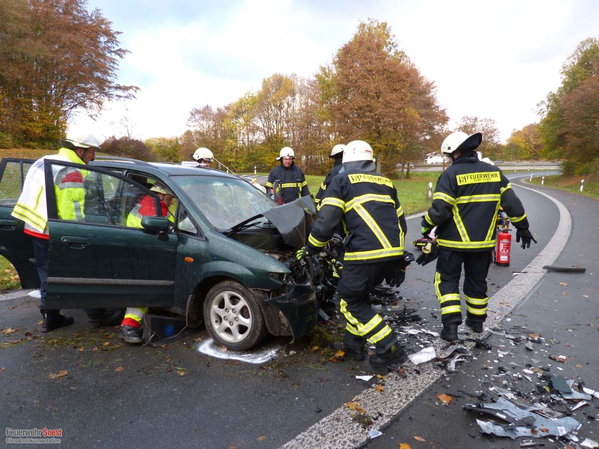 Frotalzusammenstoß zweier Pkw im Bereich der Autobahnauffahrt Soest.Eine Person wurde mit hydraulischem Rettungsgerät aus dem Fahrzeug befreit und dem Rettungsdienst übergeben.