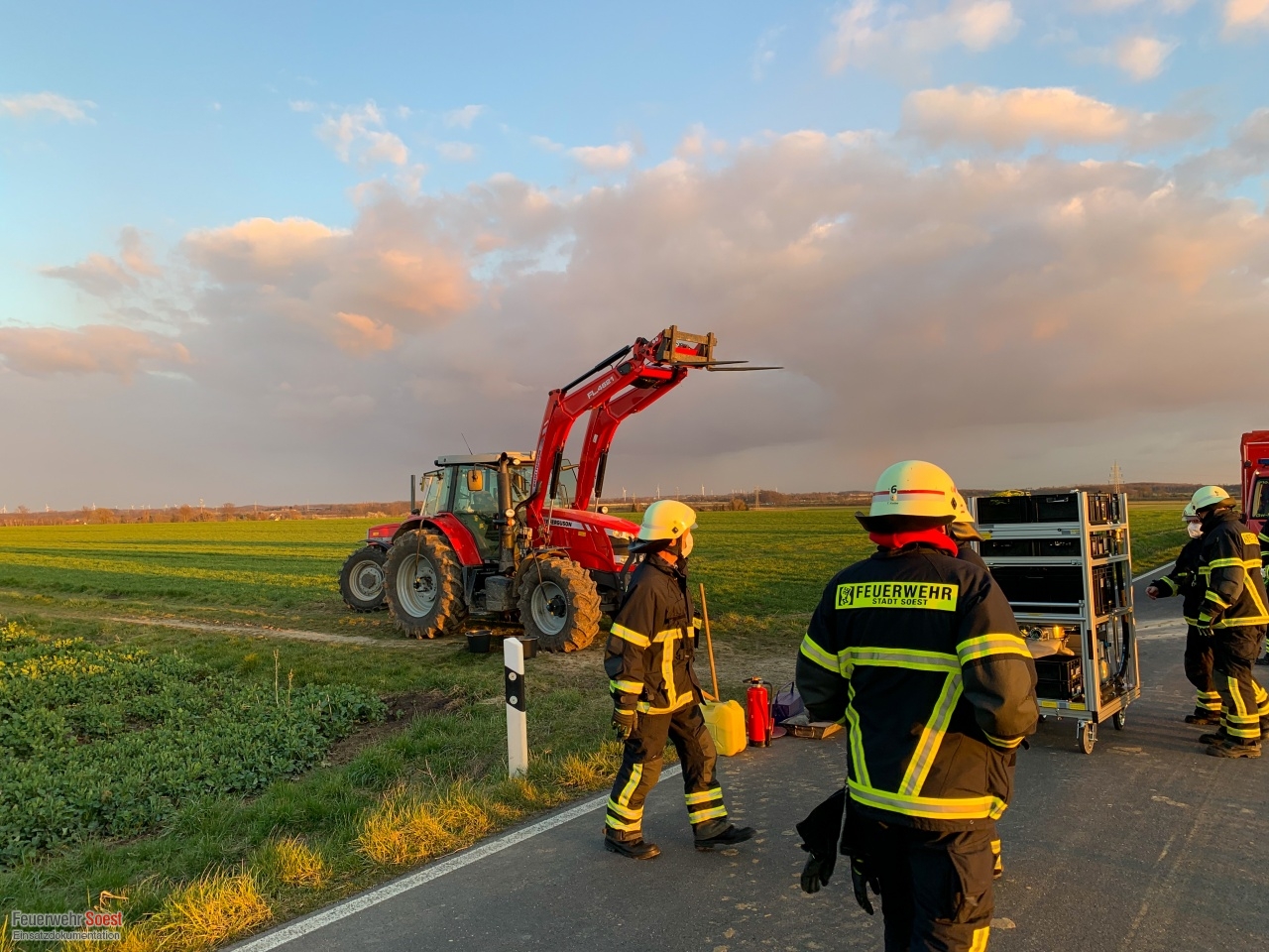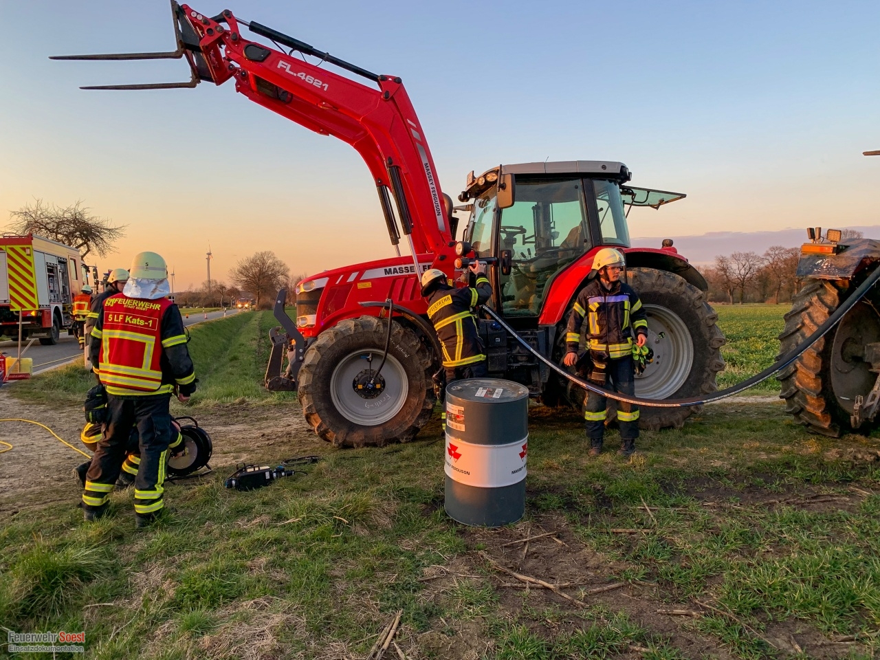Ein Traktor hatte ein Defekt an seinem Dieseltank und ca. 300 Liter Diesel drohten in das Erdreich zu fließen. Als Erstmaßnahme wurde der auslaufende Diesel aufgefangen und anschließen der restliche Tankinhalt in einen IBC-Behälter umgepumpt.